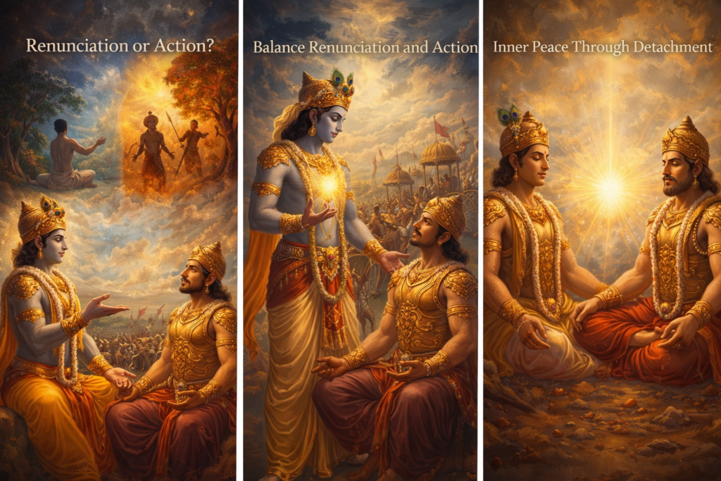 Bhagavad Gita Chapter 5 explains the balance between renunciation and action, showing how selfless work without attachment leads to inner peace and true liberation.